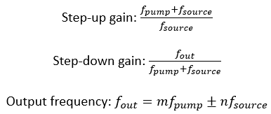 上面的參數(shù)放大器電路將通過混頻產生高次諧波和低次諧波。這些諧波在C3處產生,并輸出到惰輪電路中。僅通過使用非線性電抗組件(上面的變容二極管)進行混頻。電路產生的每個諧波以及每個組件的增益在下面的公式中定義。