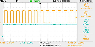 7.屏幕截圖描繪了以0-5 kHz的比例施加的5.000 kHz輸入頻率,以及其各自的5.04 V輸出。