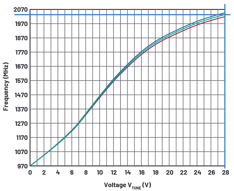 例如,可以將Synergy Microwave Corporation的DCYS100200-12 用作VCO。如圖3的曲線所示,它以28 V(V TUNE)抽出2 GHz的頻率