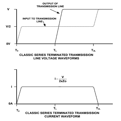 串聯(lián)終端的傳輸線 是連接CMOS器件的主要方法 ,在下面的討論中,所有提到的器件都是CMOS器件。CMOS器件實(shí)際上導(dǎo)致了ECL技術(shù)的滅亡,因?yàn)槭褂?/span>ECL,無論采取什么措施,生產(chǎn)線總是會(huì)消耗功率并導(dǎo)致大型機(jī)器出現(xiàn)嚴(yán)重的散熱問題。